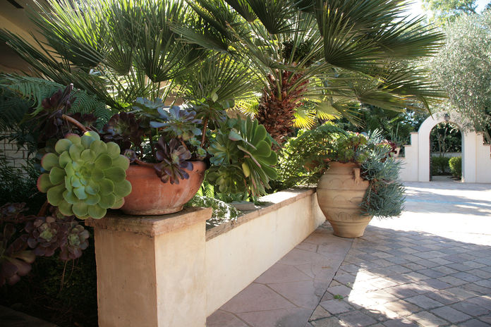 An exotic oasis in a Middle Eastern style, this terraced garden features specimens true to the Mediterranean region, with dwarf pomegranate hedges and the soothing sound of water from several fountains. Inviting walkways meander from the highest point of the property lined with fragrant Angel’s trumpet (Brugmansia spp.), exotic palms, and espaliered lemon trees. A butterfly and hummingbird garden are filled with scented geraniums, lavenders and many Salvias as attractants. The adjacent kitchen garden is planted with culinary herbs and citrus fruit within easy reach. Tall persimmon, plum, and fig trees are featured on the lowest level where they don’t interrupt the views of the Santa Barbara Riviera, alongside wisteria and flowering ginger beneath a rose-covered pergola. On the upper terrace is a seasonal cut-flower garden providing year-round bouquets, and another spectacular terrace designated for some three hundred roses. “This garden receives many visitors from admiring friends of the client who is also a docent of the gardens at Ganna Walska’s Lotusland,” says Trace. “She is proud of both of these gardens in her life.”